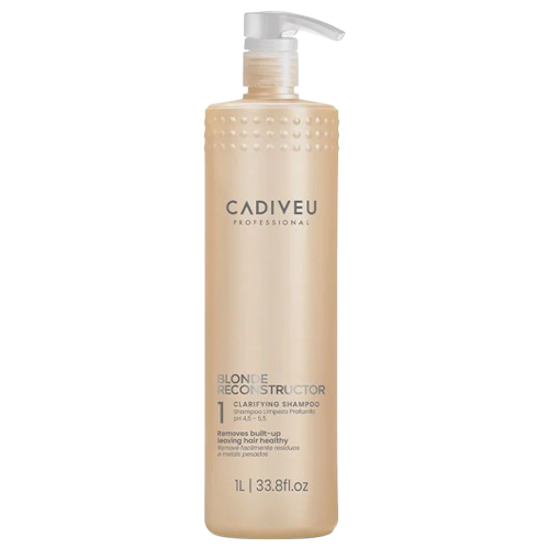 Cadiveu Blonde Reconstructor Clarifying Shampoo 1L with slightly acidic pH harmlessly deep cleanses hair, removing pollutants, heavy metals and mineral salts. Prevents from unwanted reactions during the bleaching process and improves absorption of nutrients in hair treatments.